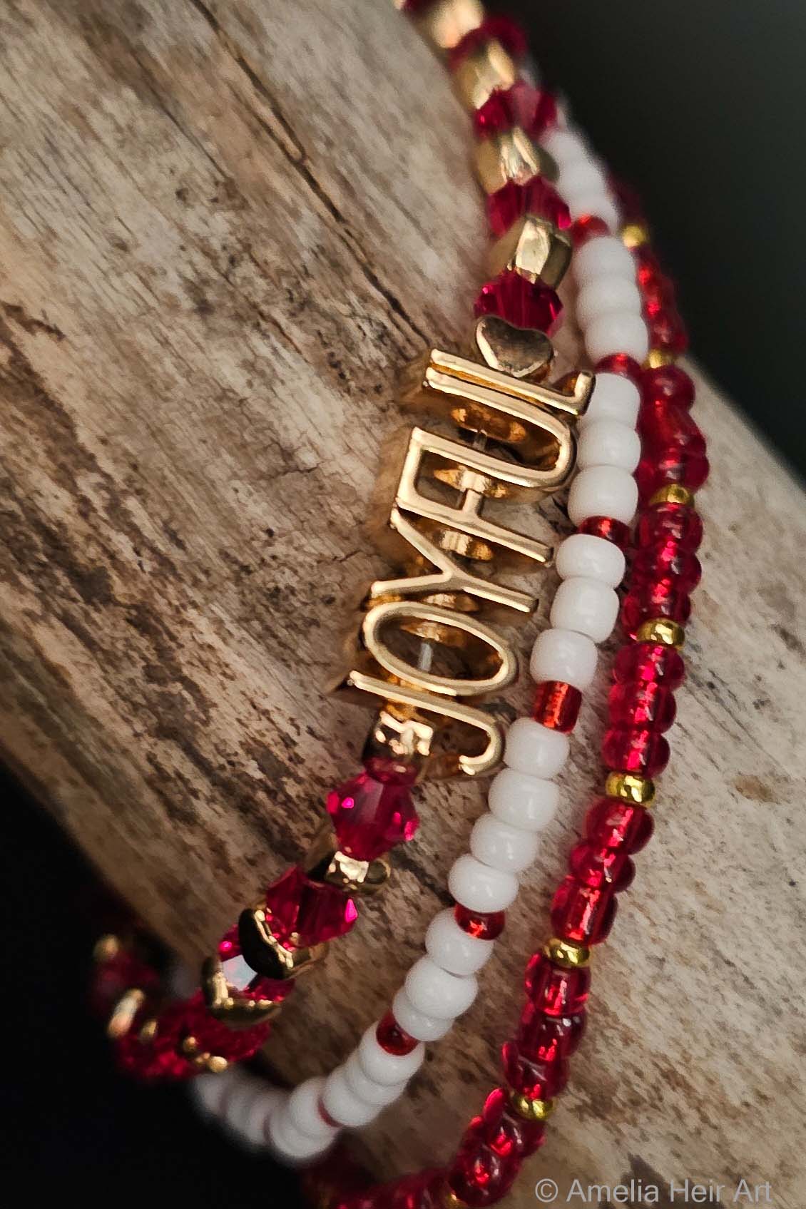 Use a measuring tape, preferably a soft flexible one often used in clothing measurements.  Wrap the measuring tape around your wrist and find the length that is most comfortable for you. Keep in mind that the bracelets are sized in ½ inch increments and are on a stretchy cord.  If you find that your comfort level is in between ½ inch sizes, move the measuring tape on your wrist to the ½ inch just smaller and the ½ inch just larger, and choose the size level that feels best for you, one with a little more give or one that is a little snug.