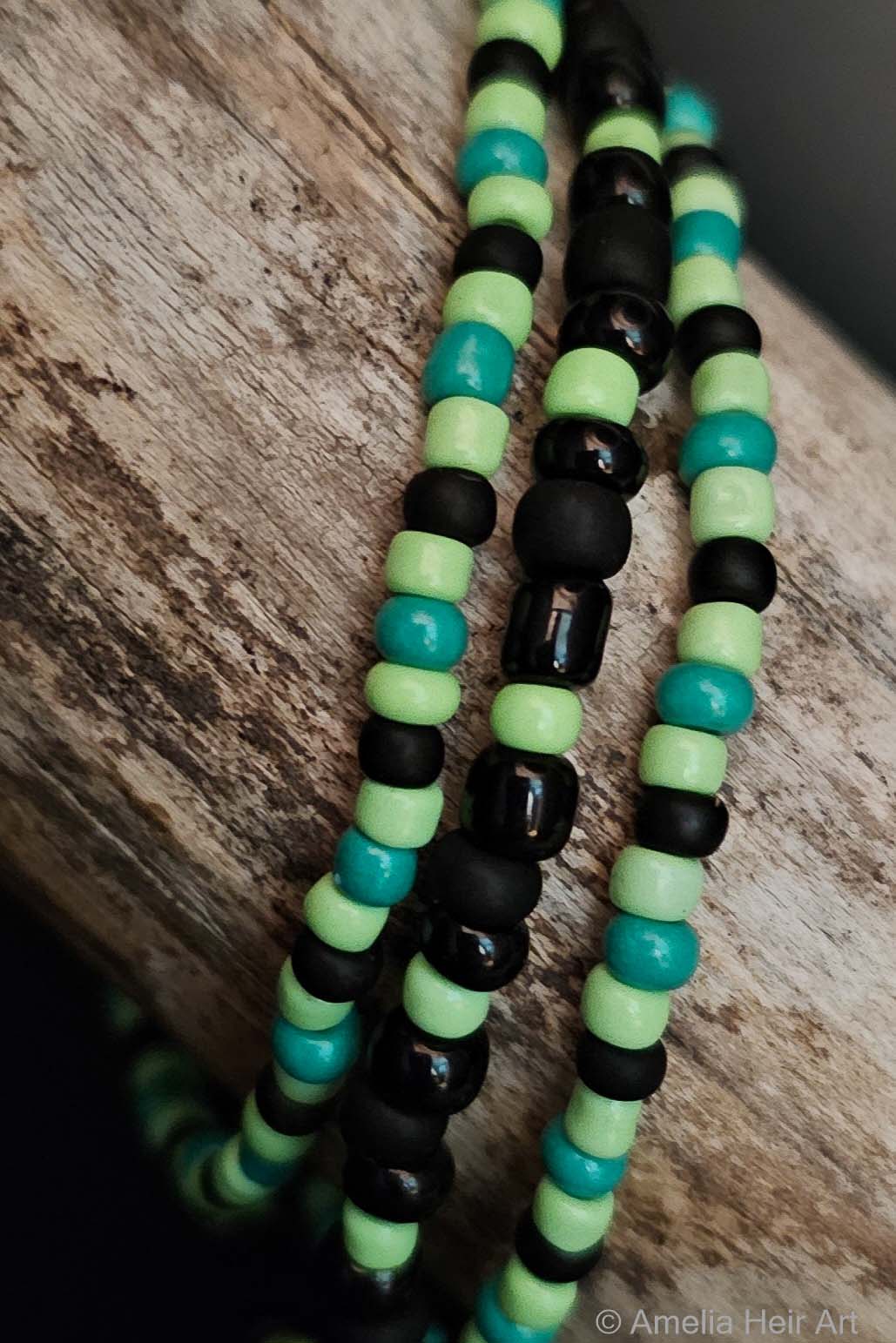 Use a measuring tape, preferably a soft flexible one often used in clothing measurements.  Wrap the measuring tape around your wrist and find the length that is most comfortable for you. Keep in mind that the bracelets are sized in ½ inch increments and are on a stretchy cord.  If you find that your comfort level is in between ½ inch sizes, move the measuring tape on your wrist to the ½ inch just smaller and the ½ inch just larger, and choose the size level that feels best for you, one with a little more give or one that is a little snug.