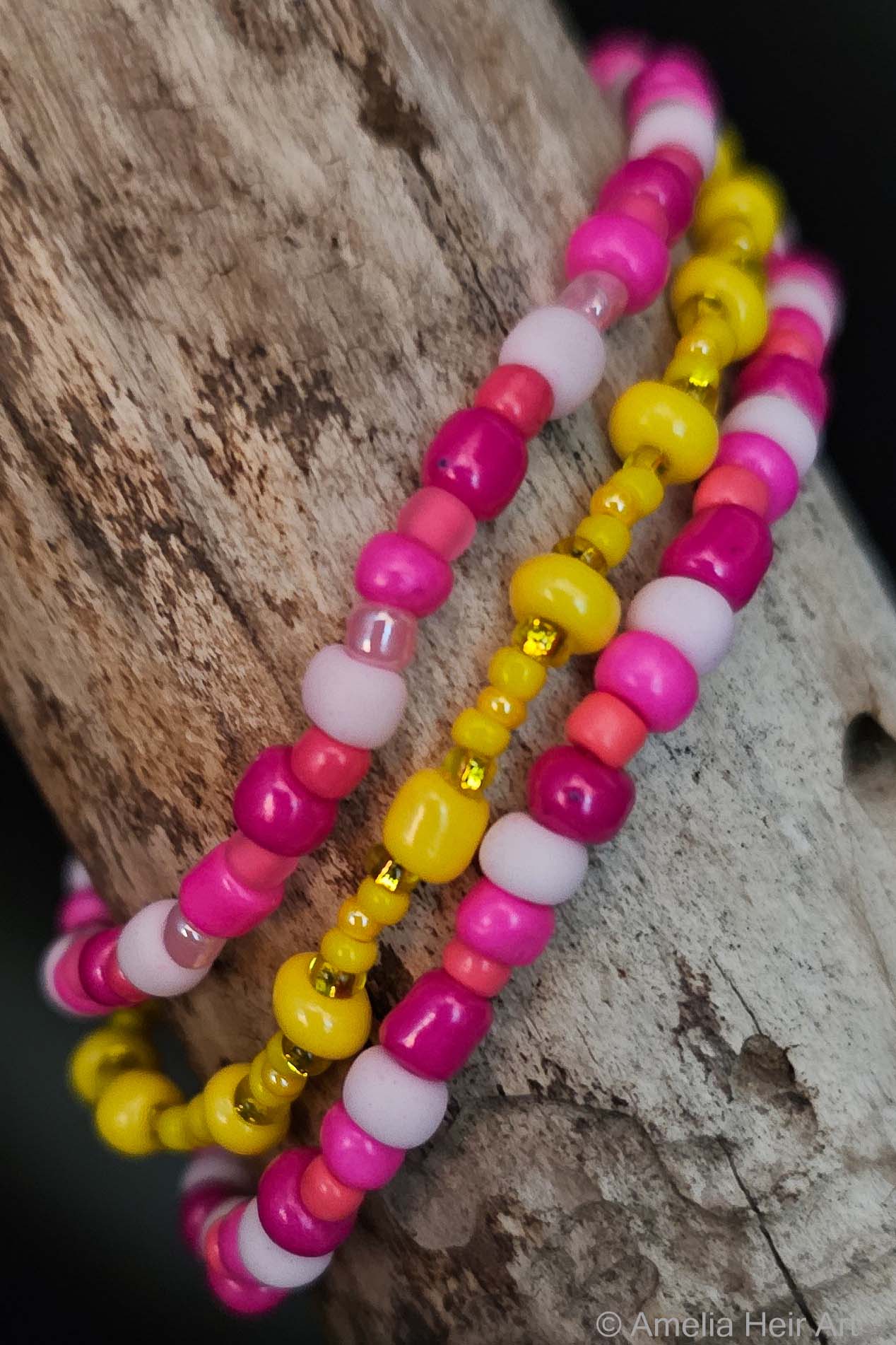 Use a measuring tape, preferably a soft flexible one often used in clothing measurements.  Wrap the measuring tape around your wrist and find the length that is most comfortable for you. Keep in mind that the bracelets are sized in ½ inch increments and are on a stretchy cord.  If you find that your comfort level is in between ½ inch sizes, move the measuring tape on your wrist to the ½ inch just smaller and the ½ inch just larger, and choose the size level that feels best for you, one with a little more give or one that is a little snug.