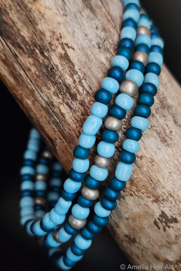 Use a measuring tape, preferably a soft flexible one often used in clothing measurements.  Wrap the measuring tape around your wrist and find the length that is most comfortable for you. Keep in mind that the bracelets are sized in ½ inch increments and are on a stretchy cord.  If you find that your comfort level is in between ½ inch sizes, move the measuring tape on your wrist to the ½ inch just smaller and the ½ inch just larger, and choose the size level that feels best for you, one with a little more give or one that is a little snug.